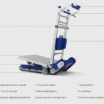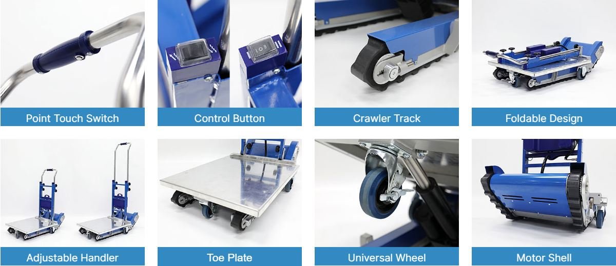 El carro sube escaleras con orugas CT250 está equipado con orugas antideslizantes y sensores que detectan automáticamente el centro de gravedad y la inclinación de las escaleras. Estos ajustan el ángulo de la plataforma de carga y permiten transportar hasta 250 kg de mercancía tanto en suelo plano como en escaleras. La batería es excepcionalmente duradera, con autonomía para subir más de 2000 escalones con una sola carga.